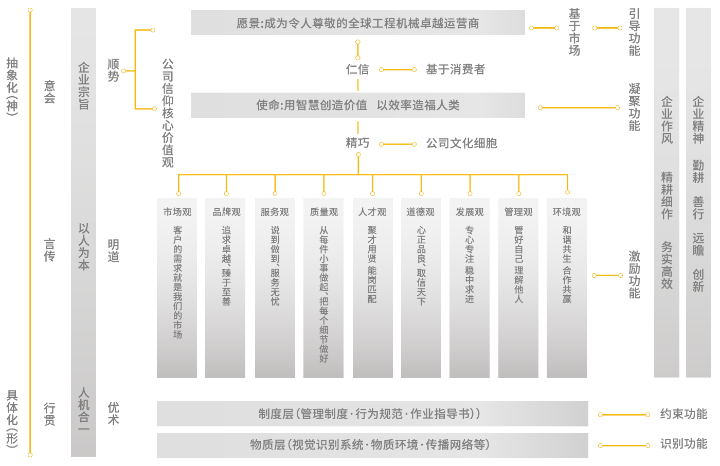 愿景位于文化框架的最上方,表明龙工文化是一种以愿景领航的文化;它基于市场提出,具有引导的功能。使命紧随其后,是基于消费者提出的,阐明了公司存在的理由和价值。这两项是顺势而为的——因为不管我们是否做好了充分的准备,工程机械市场已经是一个国际化的市场;成为国际化的大公司不仅是龙工自身发展的需要,更是市场竞争的客观要求。同时,工程机械品质的好坏由专家鉴定的时代已经过去,评鉴产品品质的主体是市场、是终端用户,我们所研发制造的产品和精心提供的服务必须满足用户的需求,得到用户的钟爱,所以使命强调了消费者的导向。